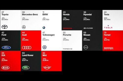 На шестой строчке дебютировала Tesla, которая в 2019 году не попала в список InterBrand. Её цена – 12,785 миллиарда долларов. Ниже расположились Ford (12,568 миллиарда долларов, -12 процентов), Audi (12,428 миллиарда долларов, -2 процента), Volkswagen (12,267 миллиарда долларов, -5 процентов) и Porsche (11,301 миллиарда долларов, -3 процента).