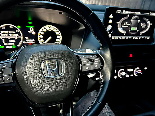 І дійсно, наш Honda ZR-V може їхати і виключно на електриці, коли рухається у «корках» чи по місту, але як тільки запас електрики у батареї закінчується, миттєво вмикається ДВЗ і генератор підзаряджає акумулятори.