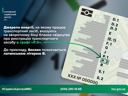 Джерело енергії, на якому працює транспортний засіб розміщуються на зворотному боці бланка свідоцтва про реєстрацію транспортного засобу в графі «P.3». До прикладу, бензин позначається латинською літерою – B.
