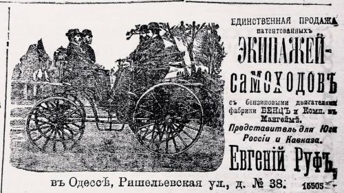 Нагадаємо, що перший автомобіль в Одесу привіз редактор газети "Одеський листок" Василь Навроцький у 1891 році. А вже поява автомобільного ринку, зі звичними нам дилерами і рекламою, відбулася у грудні 1895 року, коли в Одесі запрацював перший представник автомобільної фірми Евген Руф. В рекламі (до речі це була саме перша на українських землях автомобільна реклама) була зазначена і адреса: вулиця Решиль'євська, 38.