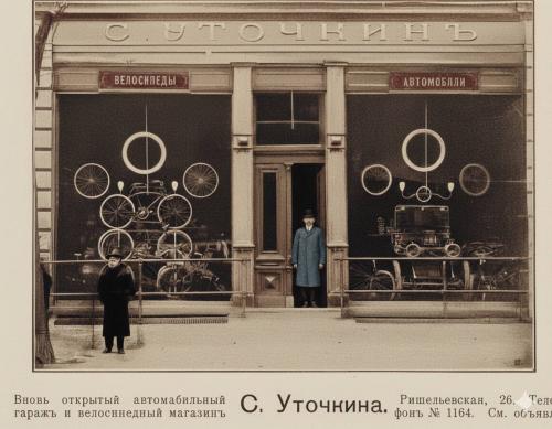 Виглядав він приблизно так, як на фото має вигляд магазин Сергія Уточкіна. До речі, цей магазин мав адресу теж на вулиці Решел'євській, тільки у будинку №26.І відкрився автосалон Сергія Уточкіна у 1905 році.